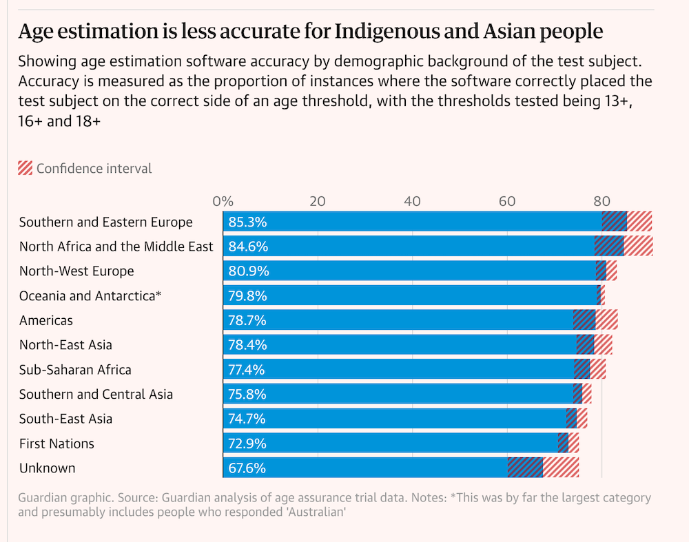 And the AATT report also notes that error rates are higher for "users with darker skin tones". The Guardian's Social media ban trial data reveals racial bias in age checking software, based on additional analysis of the underlying data, has a helpful chart here (on the next page). The report doesn’t include any discussion of biases against trans, binary, or gender-nonconforming people or intersectional analyses Black, Asian, and Indigenous women; error rates are typically higher in all these scenarios.