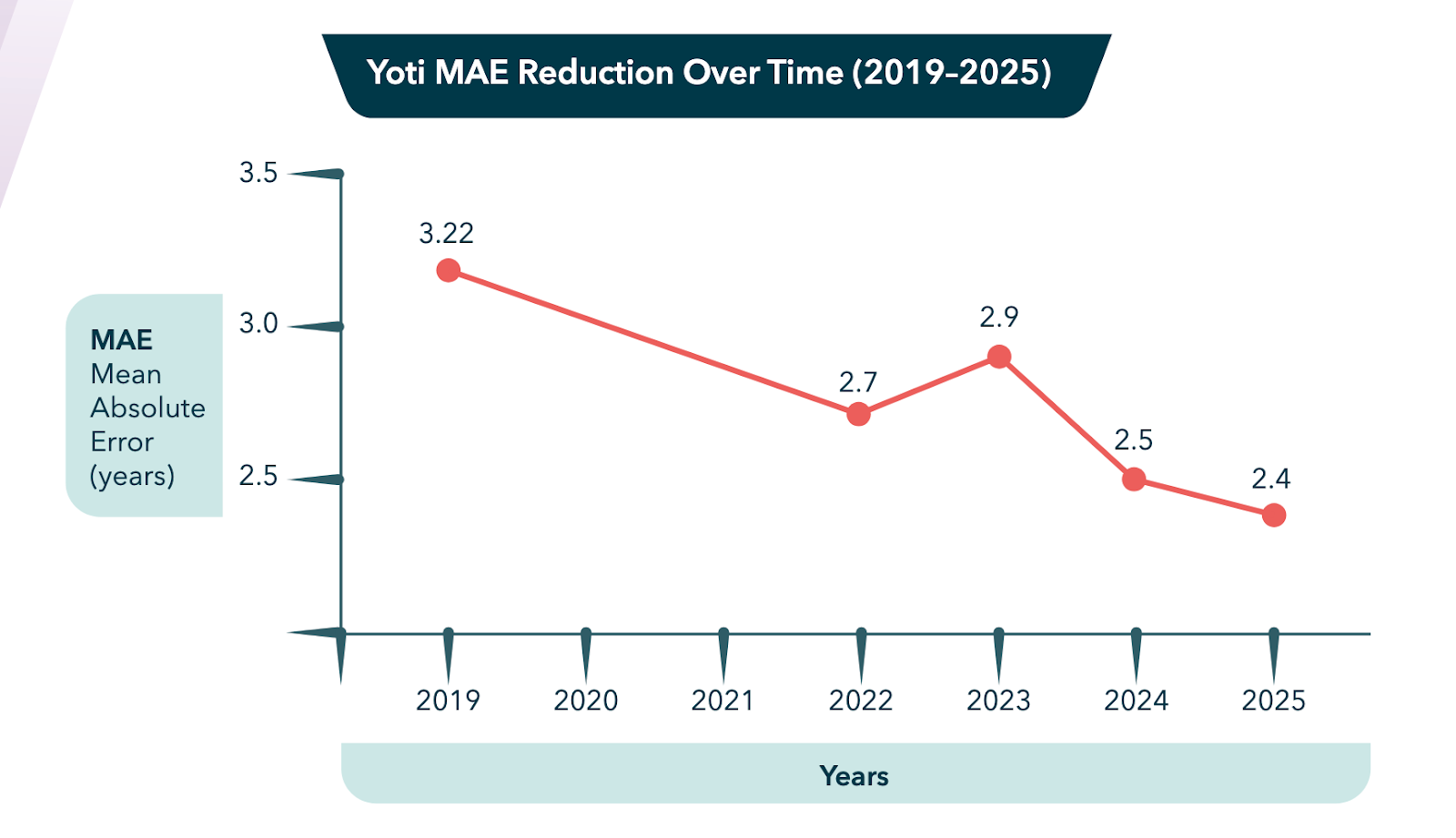 A few things to note in this example. First of all, despite the improvements, it's still bad; as of 2025, this system’s estimate was incorrect by an average of 2.4 years (and remember it’s worse for 16-to-20-year olds and people with “darker skin tones.” And despite the clever presentation on the chart, improvement has actually been relatively slow, decreasing an average of .14 MAE/year. And, what's with that blip where it got worse in 2023? Clearly this vendor's quality control wasn't good enough to prevent them from shipping a major regression. As age estimation gets more widely adopted, what are the impacts of these kinds of errors?